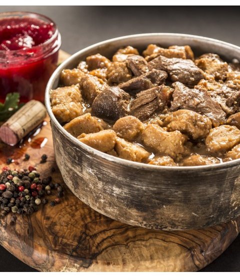 Wildfleisch (30%), Kartoffelknödel (28%) (Kartoffeln, Weizenmehl, Grieß, Eier, Salz), Pflanzenwurzel (Karotten, Sellerie, Petersilie), Rotwein, Sonnenblumenöl, Speck, Tomatenpüree (Tomaten, Salz, Zucker), Weizenmehl, Zitrone, Ribiselmarmelade (rote Johannisbeeren, Zucker, Pektin), Zucker, Salz, Kräuter