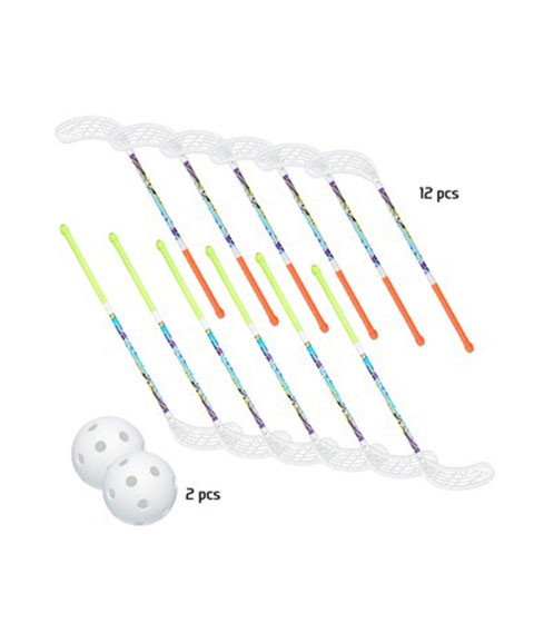 Das Floorball-Set ist für Freizeitspieler optimal geeignet. Ein Satz beinhaltet 12 Floorballschläger (6 x grün + 6 x orange) + 2 Stk. Training Bälle, Länge 75 cm.